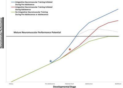 Figure: Conceptual model that compares the effects of integrative neuromuscular training initiated at different times in youth.